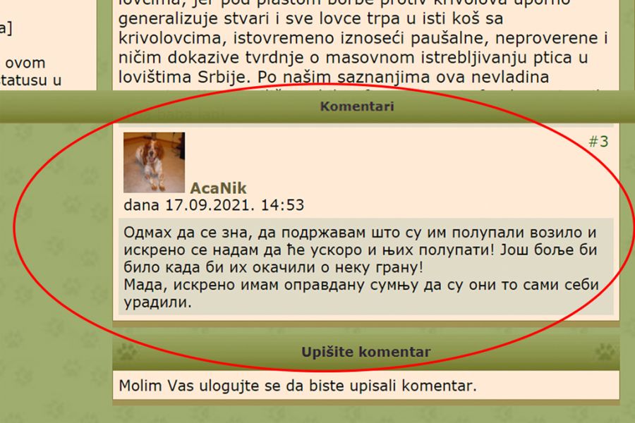 Opskurni lovački forum koji godinama unazad poziva na linč zaštitara prirode objavio je komentar svog člana u kome on kao reakciju na vest da je terensko vozilo Društva za zaštitu i proučavanje ptica Srbije (DZPPS) demolirano izjavljuje da...